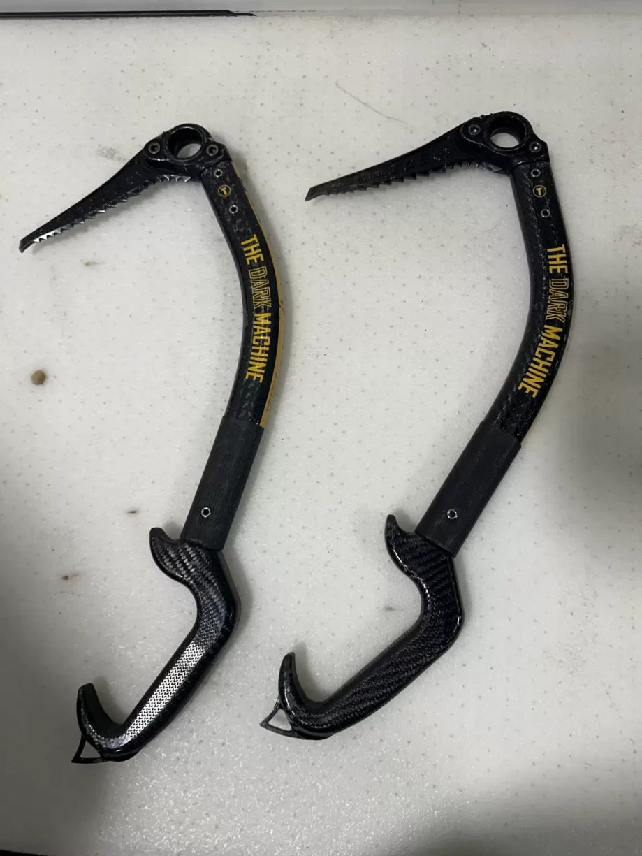 Technical axes for ice climbing, mixed climbing, and dry tooling. Very light, with G-bone carbon-composite shaft and full carbon handle, extremely well balanced, the Dark Machine is designed mainly for ice climbing. Very light at only 470 grams, the geometry offers a higher center of gravity (more towards the head), that allows a much better swing. The head is compatible with VARIO Blade System, an innovative light and modular system for interchangeable blades and accessories: naked, mini-hammer, hammer and adze on all blade options.