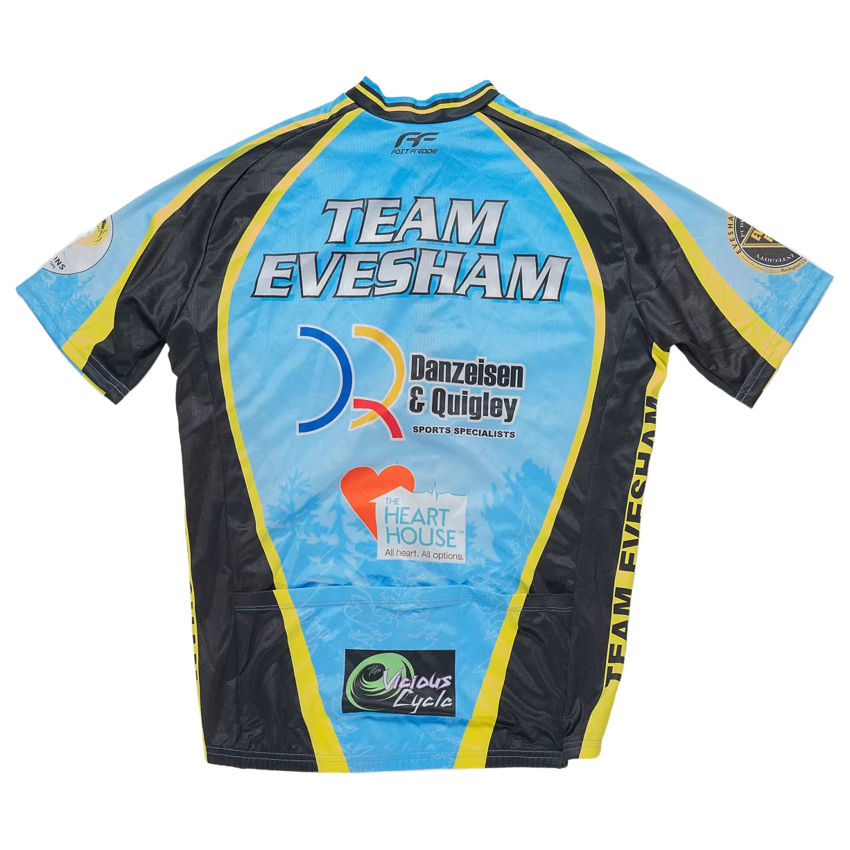 Hit the road or the trails with the sleek performance of the Fast Freddie Apparel Team Evesham Bike Jersey. Designed with serious cyclists in mind, this jersey features a race-fit cut that hugs the body closely, ensuring aerodynamic efficiency and comfort during high-speed pursuits. Crafted from a high-quality, breathable fabric, it expertly wicks moisture away from the skin, keeping you dry and cool as you push your limits. Plus, the fabric's four-way stretch capability allows for an unrestricted range of motion, so you can maneuver with ease and precision on every ride.