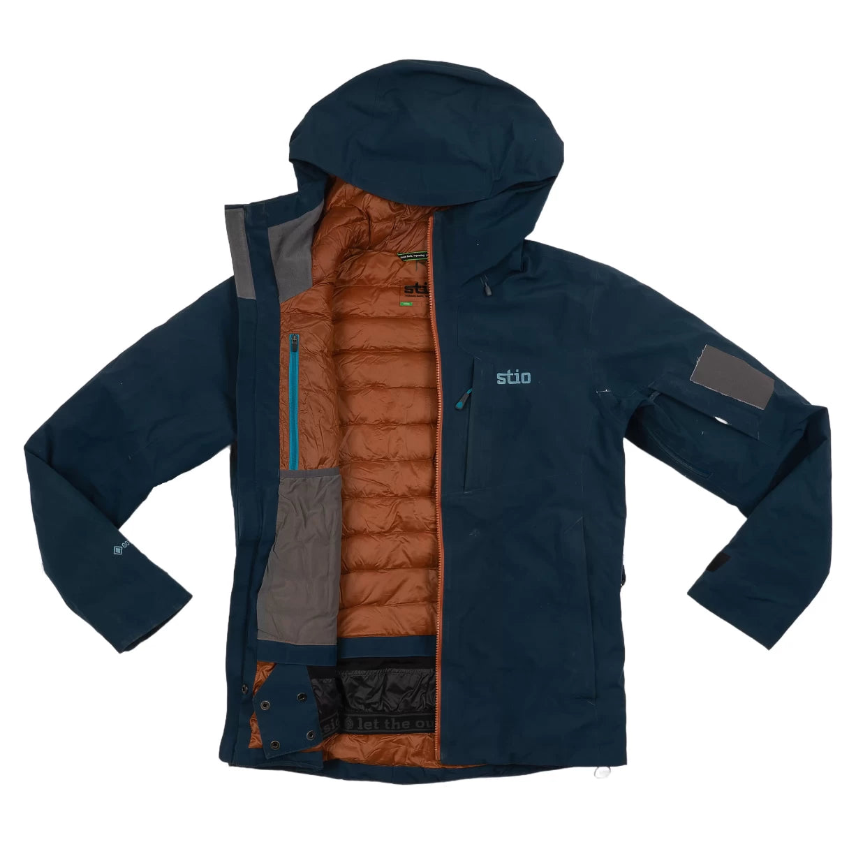 - Removable snow skirt with custom Stio® Let the Outside In gripper elastic and Stio® snaps